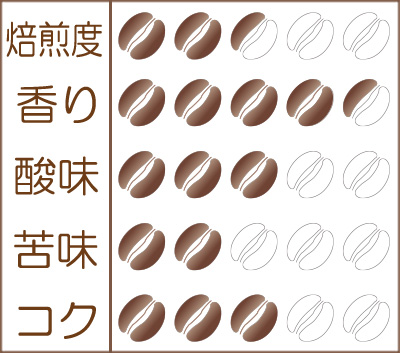 [ 苦味 ] 優しい口当たりの中、甘味のある苦味が全体を支えている。重みのない感覚は、ストレート豆では出せない配合の妙。ブレンドならではの表現です。